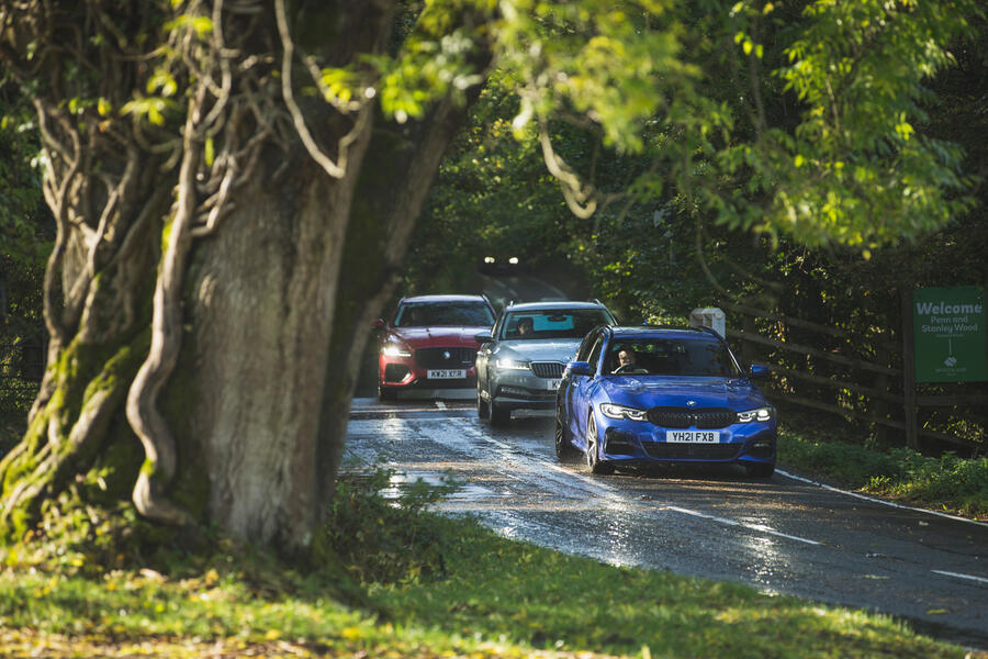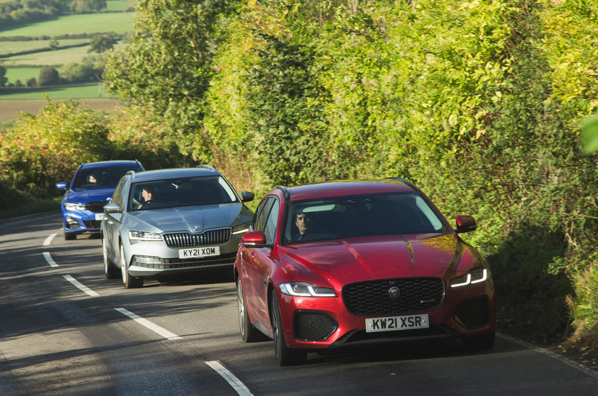 Ладно, хватит цифр: давайте посмотрим на машины. Вы, конечно, никогда бы не догадались, что XF с красивыми пропорциями не является самым дорогим из нашего трио. Он привлекает больше всего внимания и имеет наибольшее присутствие, и это не только потому, что это самый большой автомобиль здесь. Напротив, приземистый и агрессивный BMW выглядит слишком суетливо, в то время как элегантная, но немного мягкая Skoda выглядит немного недоедающей на своих 18-дюймовых колесах. Тем не менее, это поместья, так что, конечно, функция так же важна, как и форма?